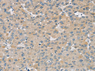 The image on the left is immunohistochemistry of paraffin-embedded Human liver cancer tissue using CSB-PA169309(SMOC2 Antibody) at dilution 1/30, on the right is treated with synthetic peptide. (Original magnification: ×200)