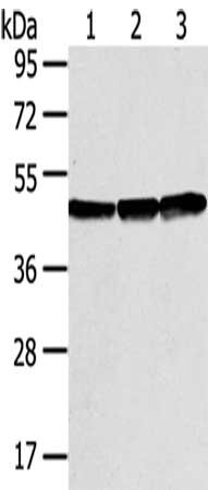 Gel: 8%SDS-PAGE,Lysate: 40 μg,Lane 1-3: 293T cells, Hela cells, 231 cells,Primary antibody: CSB-PA224595(SMYD3 Antibody) at dilution 1/400 dilution,Secondary antibody: Goat anti rabbit IgG at 1/8000 dilution,Exposure time: 5 seconds