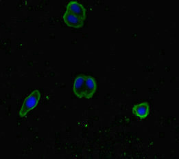 Immunofluorescent analysis of HepG2 cells using CSB-PA806844LA01HU at dilution of 1:100 and Alexa Fluor 488-congugated AffiniPure Goat Anti-Rabbit IgG(H+L)