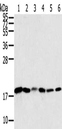 Gel: 12%SDS-PAGE, Lysate: 40 μg, Lane 1-6: Human colon sigmoideum cancer tissue, Human colon cancer tissue, mouse lung tissue, human normal colon tissue, lovo cells, hela cells, Primary antibody: CSB-PA589999(SNX3 Antibody) at dilution 1/250, Secondary antibody: Goat anti rabbit IgG at 1/8000 dilution, Exposure time: 10 seconds