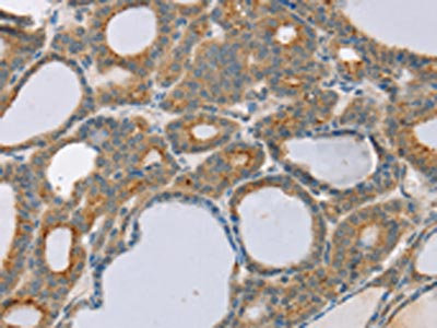 The image on the left is immunohistochemistry of paraffin-embedded Human thyroid cancer tissue using CSB-PA239255(SNX30 Antibody) at dilution 1/20, on the right is treated with synthetic peptide. (Original magnification: ×200)