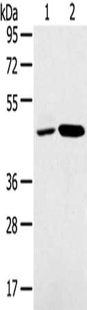 Gel: 8%SDS-PAGE, Lysate: 40 μg, Lane 1-2: K562 cells, Jurkat cells, Primary antibody: CSB-PA287873(SNX5 Antibody) at dilution 1/250, Secondary antibody: Goat anti rabbit IgG at 1/8000 dilution, Exposure time: 1 minute