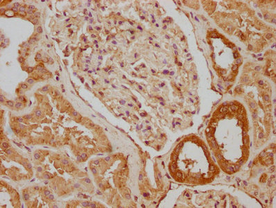 IHC image of CSB-PA872015LA01HU diluted at 1:640 and staining in paraffin-embedded human kidney tissue performed on a Leica BondTM system. After dewaxing and hydration, antigen retrieval was mediated by high pressure in a citrate buffer (pH 6.0). Section was blocked with 10% normal goat serum 30min at RT. Then primary antibody (1% BSA) was incubated at 4°C overnight. The primary is detected by a biotinylated secondary antibody and visualized using an HRP conjugated SP system.