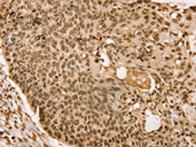 The image on the left is immunohistochemistry of paraffin-embedded Human esophagus cancer tissue using CSB-PA547919(SNX8 Antibody) at dilution 1/30, on the right is treated with fusion protein. (Original magnification: ×200)
