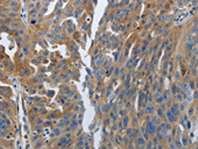 The image on the left is immunohistochemistry of paraffin-embedded Human gastric cancer tissue using CSB-PA634030(SOCS1 Antibody) at dilution 1/70, on the right is treated with synthetic peptide. (Original magnification: ×200)