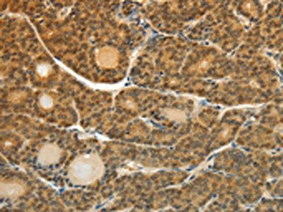 The image on the left is immunohistochemistry of paraffin-embedded Human thyroid cancer tissue using CSB-PA796488(SOCS5 Antibody) at dilution 1/35, on the right is treated with fusion protein. (Original magnification: ×200)