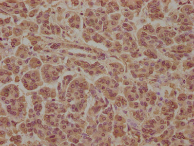 IHC image of CSB-PA22327A0Rb diluted at 1:100 and staining in paraffin-embedded human pancreatic tissue performed on a Leica BondTM system. After dewaxing and hydration, antigen retrieval was mediated by high pressure in a citrate buffer (pH 6.0). Section was blocked with 10% normal goat serum 30min at RT. Then primary antibody (1% BSA) was incubated at 4°C overnight. The primary is detected by a biotinylated secondary antibody and visualized using an HRP conjugated SP system.