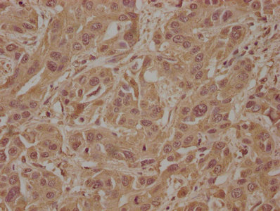 IHC image of CSB-PA22327A0Rb diluted at 1:100 and staining in paraffin-embedded human liver cancer performed on a Leica BondTM system. After dewaxing and hydration, antigen retrieval was mediated by high pressure in a citrate buffer (pH 6.0). Section was blocked with 10% normal goat serum 30min at RT. Then primary antibody (1% BSA) was incubated at 4°C overnight. The primary is detected by a biotinylated secondary antibody and visualized using an HRP conjugated SP system.