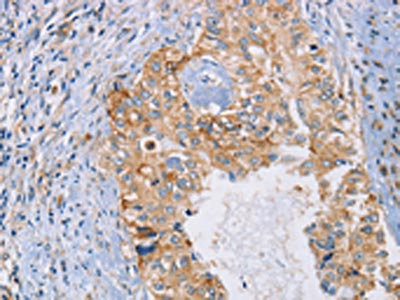 The image on the left is immunohistochemistry of paraffin-embedded Human cervical cancer tissue using CSB-PA909564(SPAG6 Antibody) at dilution 1/30, on the right is treated with synthetic peptide. (Original magnification: ×200)