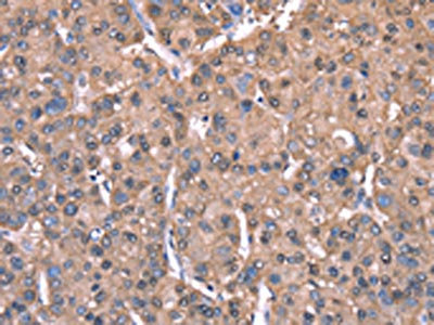 The image on the left is immunohistochemistry of paraffin-embedded Human liver cancer tissue using CSB-PA587093(SPAST Antibody) at dilution 1/40, on the right is treated with synthetic peptide. (Original magnification: ×200)