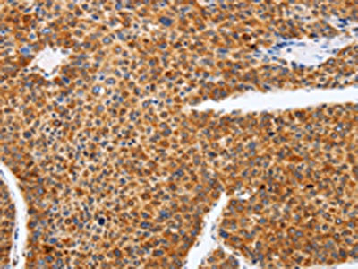 The image on the left is immunohistochemistry of paraffin-embedded Human liver cancer tissue using CSB-PA583273(SPATA13 Antibody) at dilution 1/25, on the right is treated with fusion protein. (Original magnification: ×200)