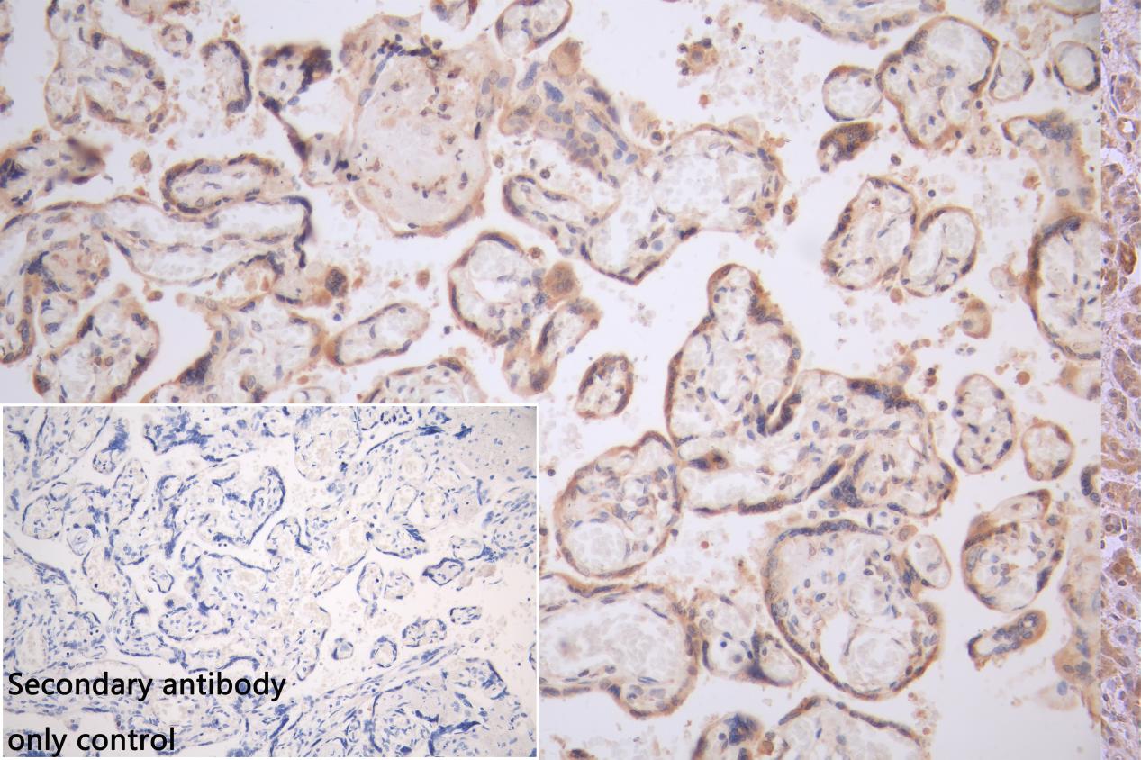 IHC image of CSB-PA022517LA01HU diluted at 1:150 and staining in paraffin-embedded human placenta tissue performed on a Leica BondTM system. After dewaxing and hydration, antigen retrieval was mediated by high pressure in a citrate buffer (pH 6.0). Section was blocked with 10% normal goat serum 30min at RT. Then primary antibody (1% BSA) was incubated at 4°C overnight. The primary is detected by a Goat anti-rabbit polymer IgG labeled by HRP and visualized using 0.05% DAB. Secondary antibody only control: uses 1% BSA instead of primary antibody
