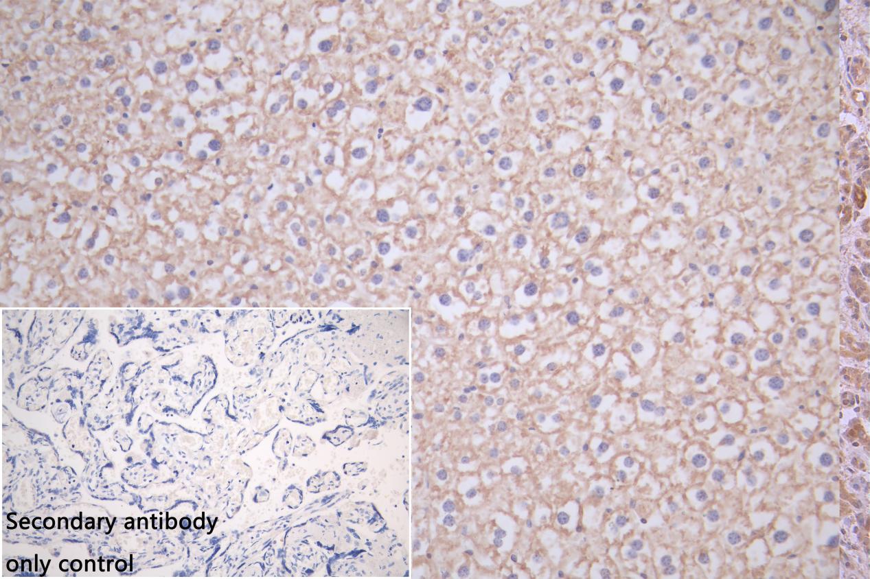 IHC image of CSB-PA022517LA01HU diluted at 1:150 and staining in paraffin-embedded mouse liver tissue performed on a Leica BondTM system. After dewaxing and hydration, antigen retrieval was mediated by high pressure in a citrate buffer (pH 6.0). Section was blocked with 10% normal goat serum 30min at RT. Then primary antibody (1% BSA) was incubated at 4°C overnight. The primary is detected by a Goat anti-rabbit polymer IgG labeled by HRP and visualized using 0.05% DAB. Secondary antibody only control: uses 1% BSA instead of primary antibody