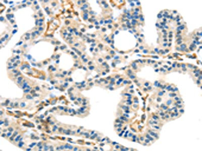 The image on the left is immunohistochemistry of paraffin-embedded Human thyroid cancer tissue using CSB-PA251124(SPDL1 Antibody) at dilution 1/40, on the right is treated with synthetic peptide. (Original magnification: ×200)