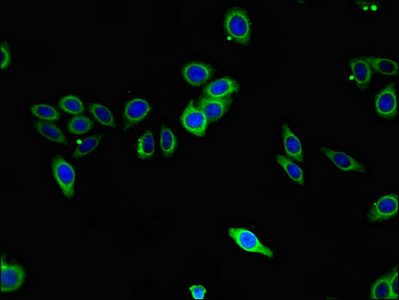 Immunofluorescent analysis of HepG2 cells using CSB-PA022564LA01HU at dilution of 1:100 and Alexa Fluor 488-congugated AffiniPure Goat Anti-Rabbit IgG(H+L)
