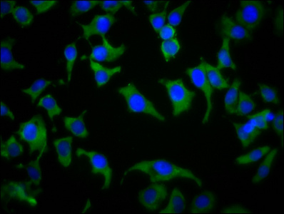 Immunofluorescence staining of A549 cells with CSB-PA823457LA01HU at 1:133, counter-stained with DAPI. The cells were fixed in 4% formaldehyde, permeabilized using 0.2% Triton X-100 and blocked in 10% normal Goat Serum. The cells were then incubated with the antibody overnight at 4°C. The secondary antibody was Alexa Fluor 488-congugated AffiniPure Goat Anti-Rabbit IgG(H+L).