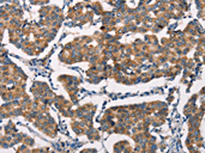 The image on the left is immunohistochemistry of paraffin-embedded Human thyroid cancer tissue using CSB-PA214577(SPR Antibody) at dilution 1/20, on the right is treated with synthetic peptide. (Original magnification: ×200)