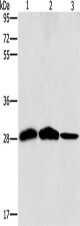 Gel: 10%SDS-PAGE, Lysate: 40 μg, Lane 1-3: Mouse liver tissue, human chromaffin cell tumor tissue, hepG2 cells, Primary antibody: CSB-PA214577(SPR Antibody) at dilution 1/1500, Secondary antibody: Goat anti rabbit IgG at 1/8000 dilution, Exposure time: 10 seconds