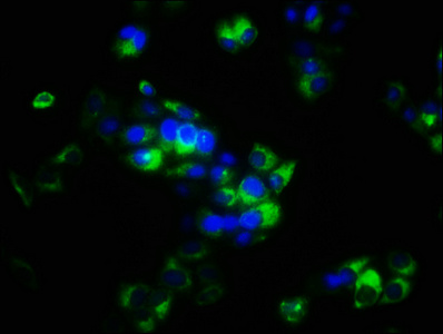 Immunofluorescence staining of PC-3 cells with CSB-PA866335LA01HU at 1:266, counter-stained with DAPI. The cells were fixed in 4% formaldehyde, permeabilized using 0.2% Triton X-100 and blocked in 10% normal Goat Serum. The cells were then incubated with the antibody overnight at 4°C. The secondary antibody was Alexa Fluor 488-congugated AffiniPure Goat Anti-Rabbit IgG(H+L).