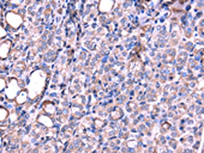 The image on the left is immunohistochemistry of paraffin-embedded Human thyroid cancer tissue using CSB-PA914515(SRPK3 Antibody) at dilution 1/20, on the right is treated with fusion protein. (Original magnification: ×200)