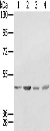 Gel: 8%SDS-PAGE, Lysate: 40 μg, Lane 1-4: K562 cells, 231 cells, Raji cells, hela cells, Primary antibody: CSB-PA127171(SSB Antibody) at dilution 1/400, Secondary antibody: Goat anti rabbit IgG at 1/8000 dilution, Exposure time: 10 seconds