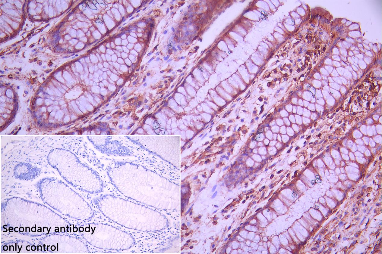 IHC image of CSB-PA852840ESR2HU diluted at 1:100 and staining in paraffin-embedded human colorectal cancer performed on a Leica BondTM system. After dewaxing and hydration, antigen retrieval was mediated by high pressure in a citrate buffer (pH 6.0). Section was blocked with 10% normal goat serum 30min at RT. Then primary antibody (1% BSA) was incubated at 4°C overnight. The primary is detected by a Goat anti-rabbit polymer IgG labeled by HRP and visualized using 0.05% DAB. Secondary antibody only control: uses 1% BSA instead of primary antibody