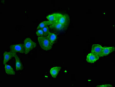 Immunofluorescent analysis of HepG2 cells using CSB-PA885805LA01HU at a dilution of 1:100 and Alexa Fluor 488-congugated AffiniPure Goat Anti-Rabbit IgG(H+L)