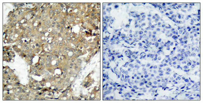 Immunohistochemical analysis of paraffin-embedded human breast carcinoma tissue using STAT1(Ab-727) Antibody(left) or the same antibody preincubated with blocking peptide(right).