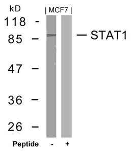 Western blot analysis of extracts from MCF7 cells using STAT1(Ab-727) Antibody and the same antibody preincubated with blocking peptide.