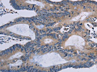 The image is immunohistochemistry of paraffin-embedded Human colon cancer tissue using CSB-PA582088(STAT1 Antibody) at dilution 1/20. (Original magnification: ×200)