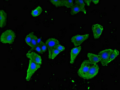 Immunofluorescent analysis of HepG2 cells using CSB-PA022815LA01HU at dilution of 1:100 and Alexa Fluor 488-congugated AffiniPure Goat Anti-Rabbit IgG(H+L)