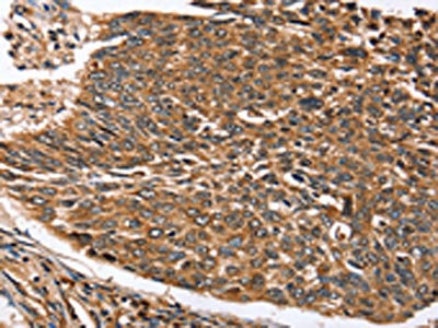 The image on the left is immunohistochemistry of paraffin-embedded Human lung cancer tissue using CSB-PA631492(STC1 Antibody) at dilution 1/20, on the right is treated with fusion protein. (Original magnification: ×200)