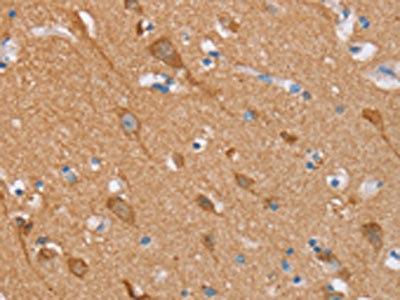 The image on the left is immunohistochemistry of paraffin-embedded Human brain tissue using CSB-PA147125(STMN1 Antibody) at dilution 1/20, on the right is treated with synthetic peptide. (Original magnification: ×200)