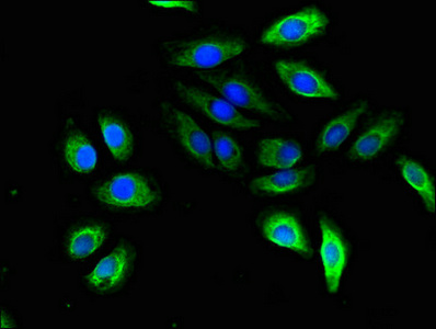 Immunofluorescent analysis of A549 cells using CSB-PA853100LA01HU at dilution of 1:100 and Alexa Fluor 488-congugated AffiniPure Goat Anti-Rabbit IgG(H+L)