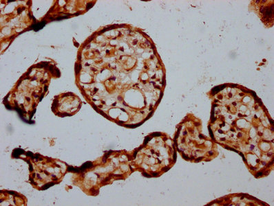 IHC image of CSB-PA823456LA01HU diluted at 1:300 and staining in paraffin-embedded human placenta tissue performed on a Leica BondTM system. After dewaxing and hydration, antigen retrieval was mediated by high pressure in a citrate buffer (pH 6.0). Section was blocked with 10% normal goat serum 30min at RT. Then primary antibody (1% BSA) was incubated at 4°C overnight. The primary is detected by a biotinylated secondary antibody and visualized using an HRP conjugated SP system.