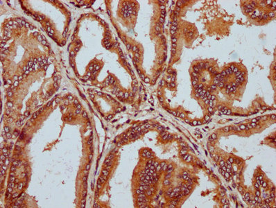 IHC image of CSB-PA823456LA01HU diluted at 1:300 and staining in paraffin-embedded human prostate tissue performed on a Leica BondTM system. After dewaxing and hydration, antigen retrieval was mediated by high pressure in a citrate buffer (pH 6.0). Section was blocked with 10% normal goat serum 30min at RT. Then primary antibody (1% BSA) was incubated at 4°C overnight. The primary is detected by a biotinylated secondary antibody and visualized using an HRP conjugated SP system.
