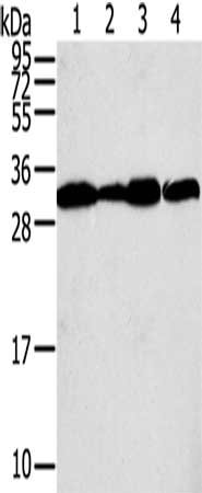 Gel: 12%SDS-PAGE, Lysate: 40 μg, Lane 1-4: A375 cells, A431 cells, lovo cells, hela cells, Primary antibody: CSB-PA225382(STX10 Antibody) at dilution 1/800, Secondary antibody: Goat anti rabbit IgG at 1/8000 dilution, Exposure time: 5 seconds