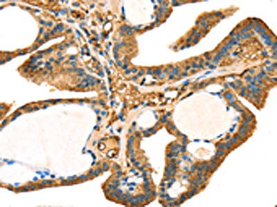 The image on the left is immunohistochemistry of paraffin-embedded Human thyroid cancer tissue using CSB-PA041704(STX18 Antibody) at dilution 1/25, on the right is treated with fusion protein. (Original magnification: ×200)
