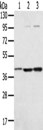 Gel: 8%SDS-PAGE, Lysate: 40 μg, Lane 1-3: Hepg2 cells, TM4 cells, Raw264.7 cells, Primary antibody: CSB-PA041704(STX18 Antibody) at dilution 1/300, Secondary antibody: Goat anti rabbit IgG at 1/8000 dilution, Exposure time: 20 seconds