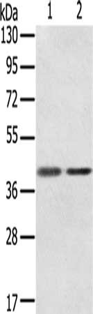 Gel: 8%SDS-PAGE, Lysate: 40 μg, Lane 1-2: Raw264.7, TM4 cells, Primary antibody: CSB-PA188001(STX18 Antibody) at dilution 1/350, Secondary antibody: Goat anti rabbit IgG at 1/8000 dilution, Exposure time: 20 seconds