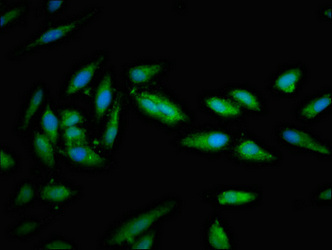 Immunofluorescent analysis of Hela cells using CSB-PA022905LA01HU at dilution of 1:100 and Alexa Fluor 488-congugated AffiniPure Goat Anti-Rabbit IgG(H+L)