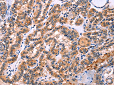 The image on the left is immunohistochemistry of paraffin-embedded Human thyroid cancer tissue using CSB-PA297913(STXBP2 Antibody) at dilution 1/20, on the right is treated with fusion protein. (Original magnification: ×200)