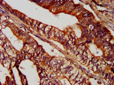 IHC image of CSB-PA846636LA01HU diluted at 1:300 and staining in paraffin-embedded human colon cancer performed on a Leica BondTM system. After dewaxing and hydration, antigen retrieval was mediated by high pressure in a citrate buffer (pH 6.0). Section was blocked with 10% normal goat serum 30min at RT. Then primary antibody (1% BSA) was incubated at 4°C overnight. The primary is detected by a biotinylated secondary antibody and visualized using an HRP conjugated SP system.