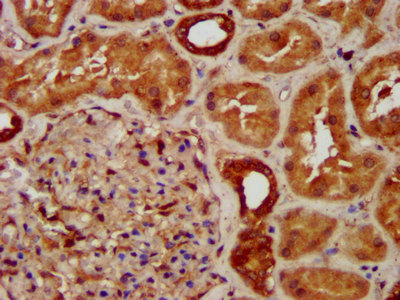 IHC image of CSB-PA846636LA01HU diluted at 1:300 and staining in paraffin-embedded human kidney tissue performed on a Leica BondTM system. After dewaxing and hydration, antigen retrieval was mediated by high pressure in a citrate buffer (pH 6.0). Section was blocked with 10% normal goat serum 30min at RT. Then primary antibody (1% BSA) was incubated at 4°C overnight. The primary is detected by a biotinylated secondary antibody and visualized using an HRP conjugated SP system.