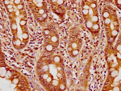 IHC image of CSB-PA022934LA01HU diluted at 1:200 and staining in paraffin-embedded human small intestine tissue performed on a Leica BondTM system. After dewaxing and hydration, antigen retrieval was mediated by high pressure in a citrate buffer (pH 6.0). Section was blocked with 10% normal goat serum 30min at RT. Then primary antibody (1% BSA) was incubated at 4°C overnight. The primary is detected by a biotinylated secondary antibody and visualized using an HRP conjugated SP system.