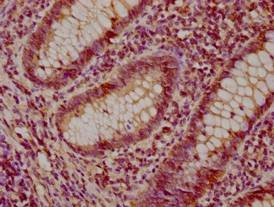 IHC image of CSB-PA022934LA01HU diluted at 1:200 and staining in paraffin-embedded human appendix tissue performed on a Leica BondTM system. After dewaxing and hydration, antigen retrieval was mediated by high pressure in a citrate buffer (pH 6.0). Section was blocked with 10% normal goat serum 30min at RT. Then primary antibody (1% BSA) was incubated at 4°C overnight. The primary is detected by a biotinylated secondary antibody and visualized using an HRP conjugated SP system.