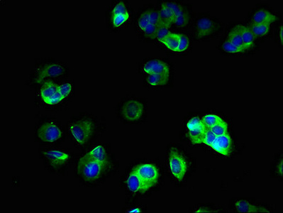 Immunofluorescent analysis of MCF-7 cells using CSB-PA022979LA01HU at dilution of 1:100 and Alexa Fluor 488-congugated AffiniPure Goat Anti-Rabbit IgG(H+L)