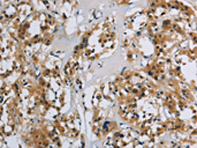 The image on the left is immunohistochemistry of paraffin-embedded Human thyroid cancer tissue using CSB-PA286879(SYN1 Antibody) at dilution 1/40, on the right is treated with synthetic peptide. (Original magnification: ×200)