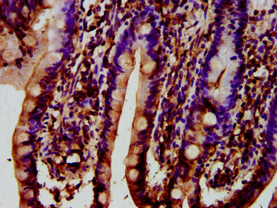 IHC image of CSB-PA023016LA01HU diluted at 1:400 and staining in paraffin-embedded human small intestine tissue performed on a Leica BondTM system. After dewaxing and hydration, antigen retrieval was mediated by high pressure in a citrate buffer (pH 6.0). Section was blocked with 10% normal goat serum 30min at RT. Then primary antibody (1% BSA) was incubated at 4°C overnight. The primary is detected by a biotinylated secondary antibody and visualized using an HRP conjugated SP system.