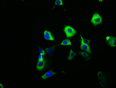Immunofluorescence staining of MCF-7 cells with CSB-PA716356LA01HU at 1:166, counter-stained with DAPI. The cells were fixed in 4% formaldehyde, permeabilized using 0.2% Triton X-100 and blocked in 10% normal Goat Serum. The cells were then incubated with the antibody overnight at 4°C. The secondary antibody was Alexa Fluor 488-congugated AffiniPure Goat Anti-Rabbit IgG(H+L).